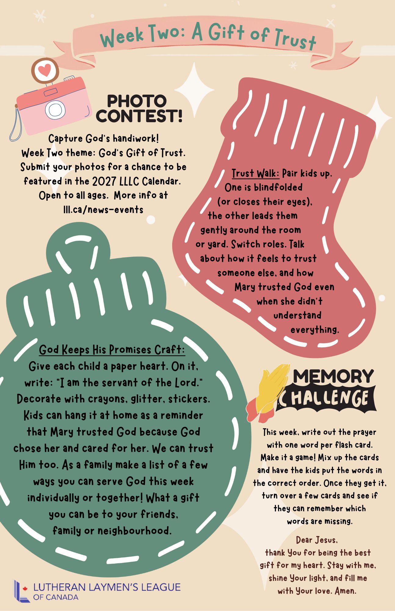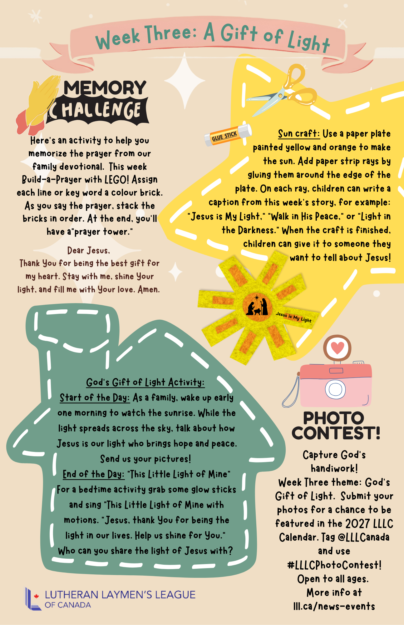 The Lutheran Laymen's League of Canada is continuing to offer a family devotional to help prepare young and old for the arrival of the Christ child. This resource is a great way to share the joy of advent with your child or grandchild!